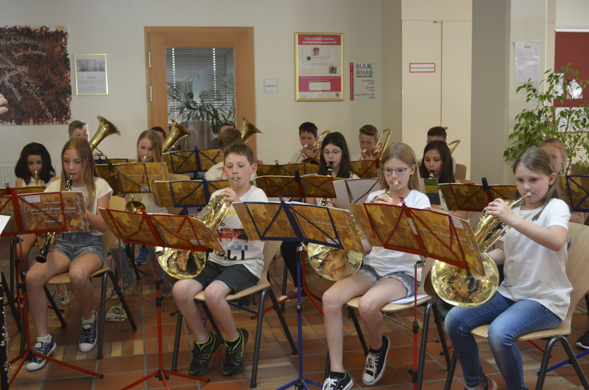 Am 4.Juni 2019 fand in der Neuen Mittelschule das schon zur Tradition gewordene Vatertagskonzert statt. Gemeinsam mit den beiden Blockflötenklassen der 3.Schulstufe der Volksschule gestaltete die Bläserklasse das Programm. Es was das zugleich deren Abschlußkonzert des 2-jährigen Zyklus. Zahlreiche Väter, Mütter und Geschwister und Verwandte waren begeistert von den musikalischen Darbietungen der von der Musikschulleiterin Birgit Buck und dem Leiter der Bläserklasse Thomas Maderthaner geführten Orchester. Neben dem Bürgermeister und dem Leiter des Musikschulverbandes waren auch die Musikschullehrer und Lehrerinnen, die die Bläserklasse 2 Jahre lang begleitet hatten, anwesend.